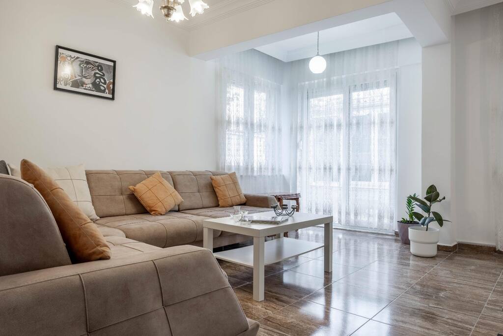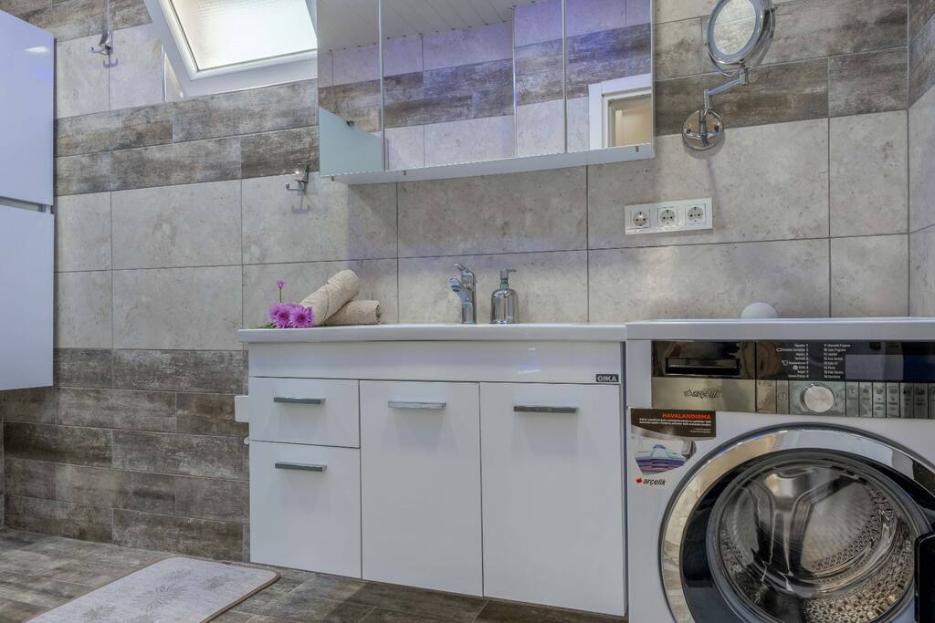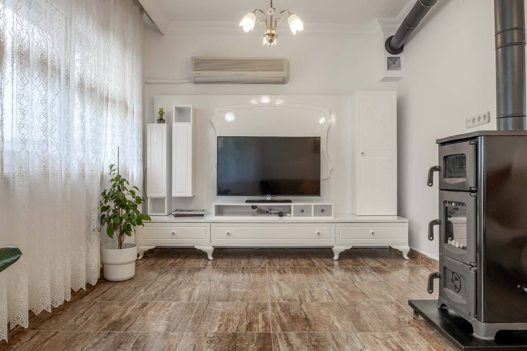 The ground floor of the Villa features a spacious living room leading into a 15m2 veranda. From the veranda guests can easily access the grass covered garden. The aforementioned kitchen is fully equipped with a dishwasher, large fridge/ freezer and everything else necessary for dining in. The living room is equipped with a FULL HD TV with satellite receiver offering many international and local channels. In addition, in the living room there is a fireplace heating system, which guests can enjoy it during the winter season.